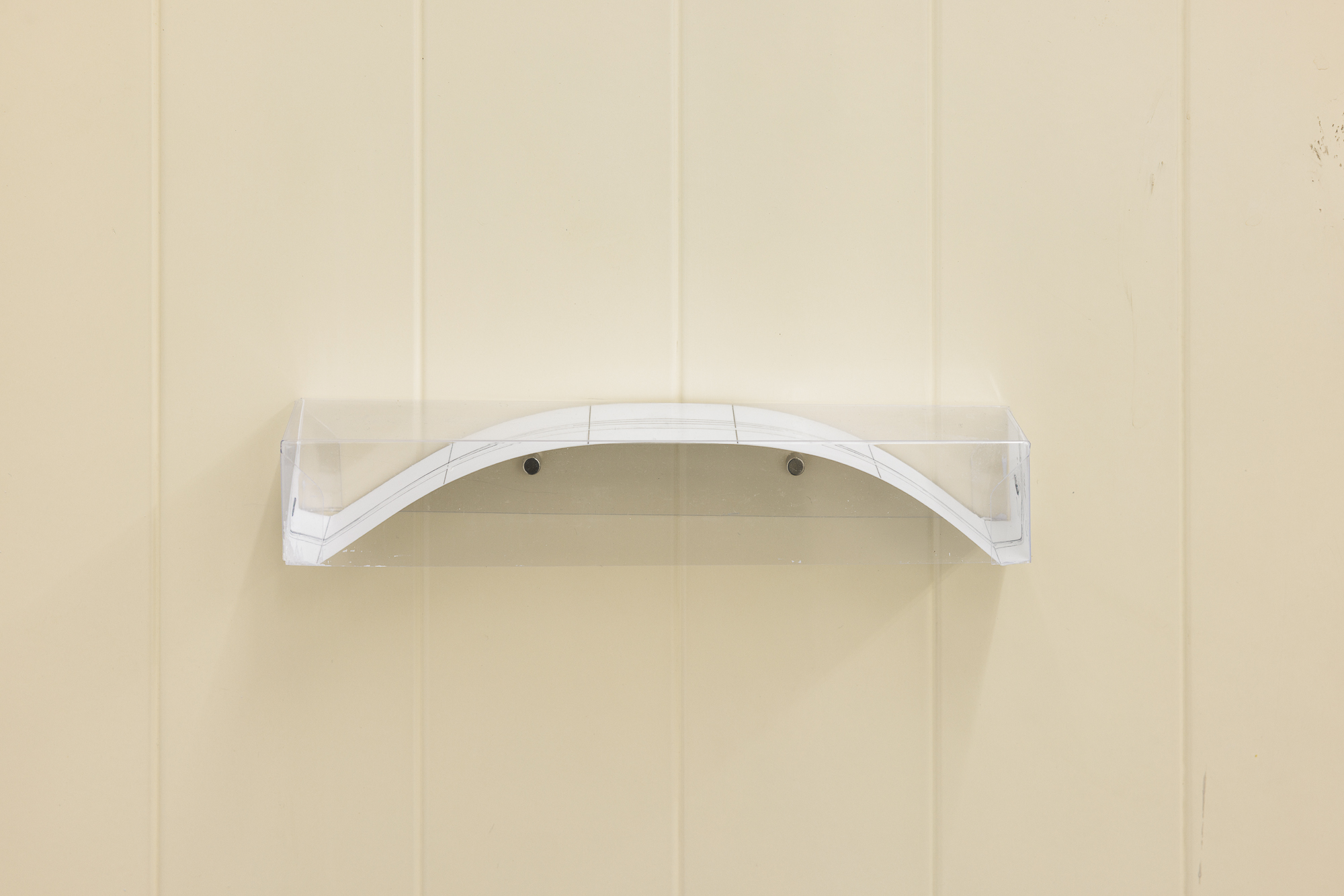 cardboard, staple, tape, anodised aluminium, finnboard, plastic round tube, (model of a place, 2021, paper, staple, space), (modular display to extend the existing pedestal formerly used in the archive used as a platform for test prints at FLACC for Kite (sleep-like), 2025 / at Jester, Genk), 40 × 15.5 × 125 cm