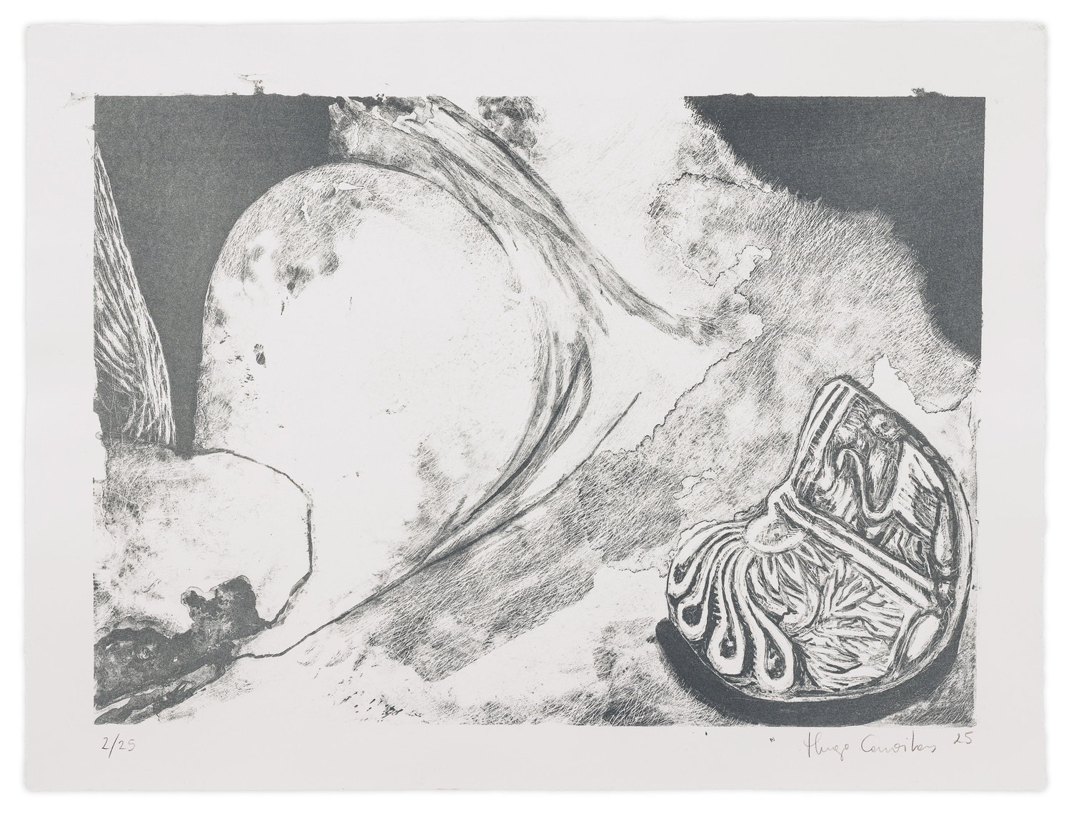 The technical implications of Hugo Canoilas's painting are reproduced in the lithographic stone: colour is reduced to black and white, with the sublimation of the shadow as a receptacle for our projections. The first motifs oscillate between animals that poetically move through their natural environments, wishing to expand the possibilities of life and relationships. Some other elements came from Esterházy Schatzkammer's Wunderkammer, where natural or manufactured objects come together. And lastly, there are also motifs from Portuguese Renaissance paintings, which nourish the symbolic and reinforce the convergence of different times, light and value systems. All these forms stimulate interrelationships as a materiality of art.