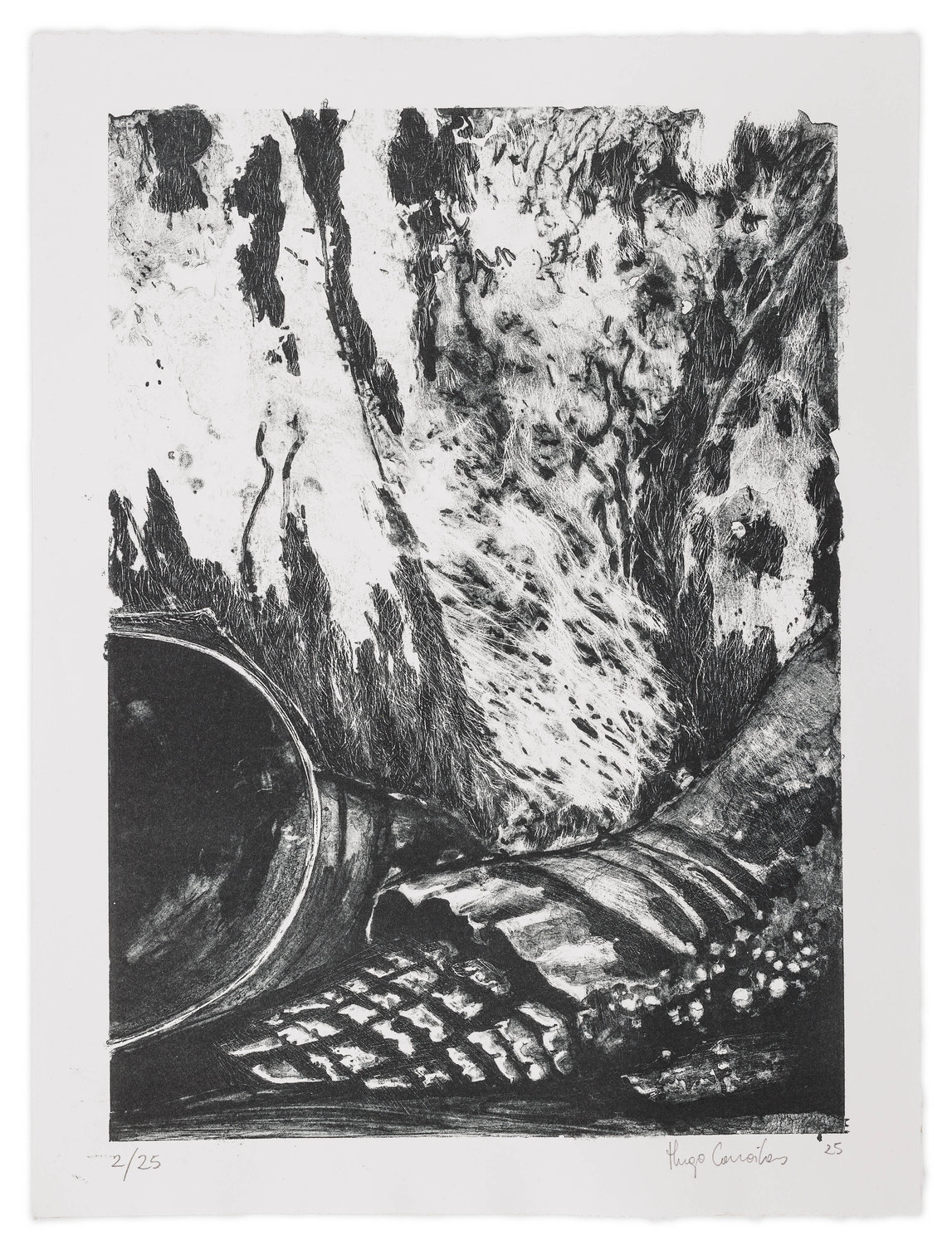 The technical implications of Hugo Canoilas's painting are reproduced in the lithographic stone: colour is reduced to black and white, with the sublimation of the shadow as a receptacle for our projections. The first motifs oscillate between animals that poetically move through their natural environments, wishing to expand the possibilities of life and relationships. Some other elements came from Esterházy Schatzkammer's Wunderkammer, where natural or manufactured objects come together. And lastly, there are also motifs from Portuguese Renaissance paintings, which nourish the symbolic and reinforce the convergence of different times, light and value systems. All these forms stimulate interrelationships as a materiality of art.